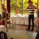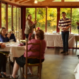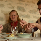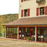 L’espace est aménagé de façon différente également, avec le salon d’extérieur sous le frêne, à l’abri du vent et du soleil, avec vue sur la combe du Morimont et tous les bâtiments du site, mais en retrait du reste de la terrasse, pour être bien tranquille. Quand on passe les pierres de meule, on revient vers le restaurant et toutes les tables discutent avec les chaises, on peut moduler les espaces et adapter la configuration à l’événement !